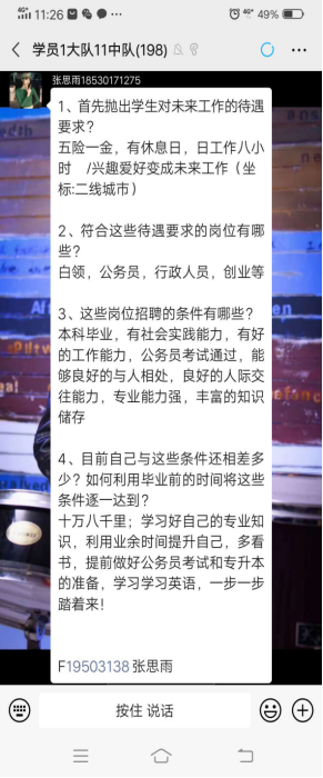 会议伊始,中队长信玲玲老师提出4个问题引导学生深度思考,首先,提问学生对毕业后的就业待遇要求;其次,引导符合这些待遇要求的岗位有哪些;再次,这些岗位招聘的条件有哪些;最后目前自己与这些条件还相差多少;如何利用毕业前的时间将这些条件逐一达到。接下来,信老师让同学们对上述的问题认真思考后作出回答,让学生对日后就业方面做了充分的准备。最后中队长信玲玲老师结合具体案例,强调身为一名警校生,更是应以身作则,树立正确的择业观和就业观, 学会科学的﹑合理的﹑灵活的规划自己的职业生涯。学员表示:“这次中队会让我对就业认识有了进一步提高,对就业观念有了全新的认识。在以后的大学生活里,我会合理的规划自己的时间,学会自我评价,对自己有一个准确的定位,为自己以后的就业做好充分的准备”