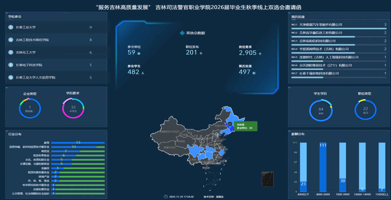 本次双选会以高质量匹配人才需求和我院人才培养特点为目标,邀请到了大众卓越控股集团、长春市顺远消防技术服务有限公司、万达长白山国际旅游度假区开发有限公司、长春市橙云信息技术有限公司等对口用人企业,极大提升了岗位吸引力。据统计59家用人单位参加线上双选活动,共为毕业生提供就业岗位2905个,吸引近400名本校毕业生及百余名省内其他高校毕业生参与。