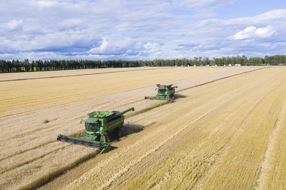 联合收割机在黑龙江北大荒集团红星农场有限公司田间收获小麦(2022年8月10日摄,无人机照片)。新华社记者 谢剑飞 摄