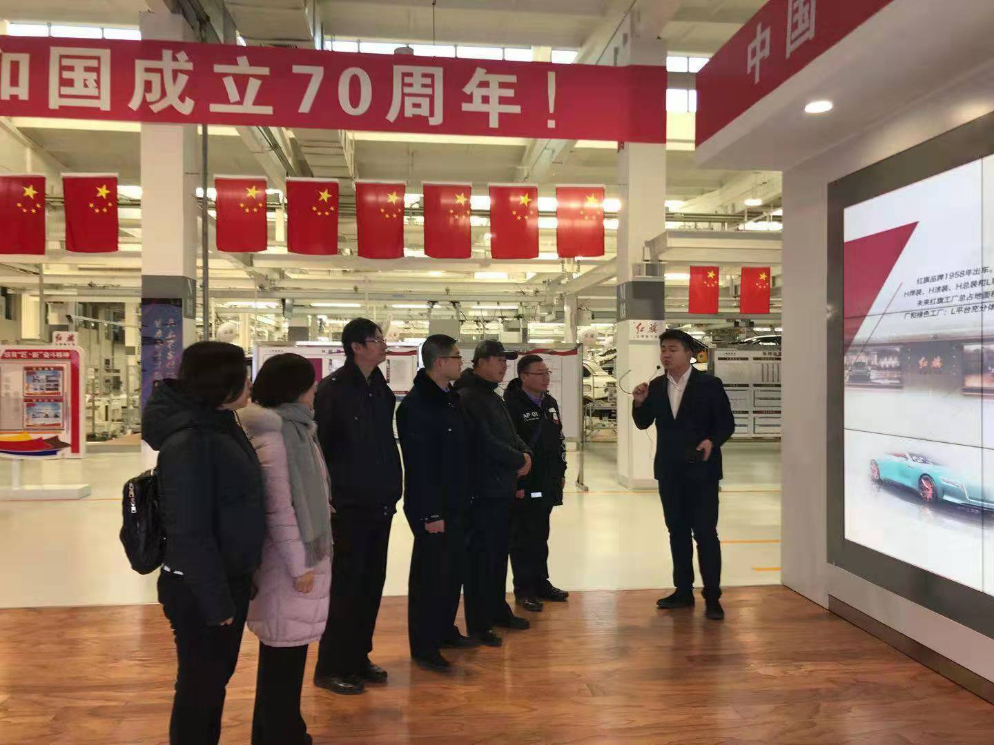 随后,大家来到一汽集团公司红旗工厂参观红旗H(S)/L汽车生产线。进入车间,首先映入眼帘的是毛泽东主席手书的“红旗”二字。在工作人员的热情讲解中大家感受了一汽红旗工厂的质量文化、品牌文化和企业文化。一台台工业机器人把汽车零部件精准送到各个工位,为数不多的装配工人利用现代化生产设备和工具把整车组装完成并开下生产线。一汽红旗工厂的现代化生产流程是一汽集团发展历程的一个缩影,更是体现了国家七十年建设发展取得的辉煌成就。参观红旗工厂,让全体支部党员充分认识到坚定中国特色社会主义道路自信、理论自信、制度自信、文化自信的重要性。