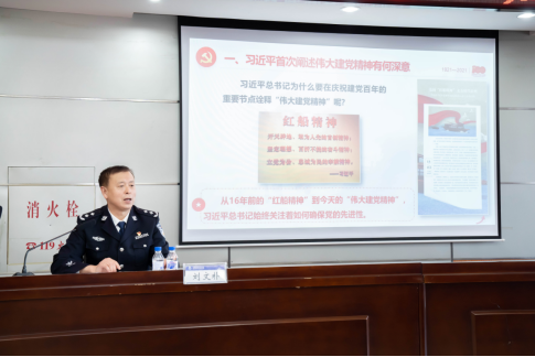 院长刘文朴首先以“学史明理、学史增信、学史崇德、学史力行,学党史、悟思想、办实事、开新局”党史学习教育的意义开篇,围绕“伟大建党精神是奠定中国共产党人精神谱系的根基”这一主题,解读了习近平总书记在庆祝建党百年的重要节点诠释“伟大建党精神的重要意义,阐释伟大建党精神是中国共产党的精神谱系之源,以及中国共产党人精神谱系的坚实根基来源于马克思主义理论的科学指引和对中华优秀传统文化的继承和弘扬等内容。从四个方面讲解了“坚持真理、坚守理想,践行初心、担当使命,不怕牺牲、英勇斗争,对党忠诚、不负人民的伟大建党精神”的内涵。