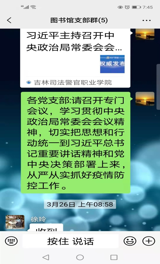 疫情发生以来,图书馆党支部积极响应学院号召,在学院党委的坚强领导下,全力以赴做好疫情防控工作,积极落实上级机关各项要求,明确责任分工,以高度的责任感做细、做实、做好各项防控工作。及时通过工作微信群、视频会议等方式,认真学习习近平总书记关于疫情防控工作的重要讲话精神,全覆盖传达上级和学院党委对疫情防控相关要求,大力宣传科普疫情防控知识,使支部全体同志第一时间了解和掌握。