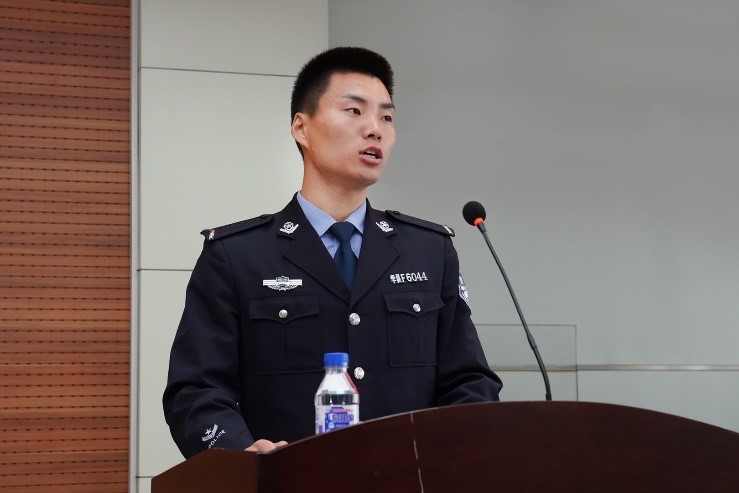 在校学生代表二大队24中队司法助理专业刘晨阳同学分享了自步入校园以来的所见所悟,鼓励新同学勇于尝试、敢于拼搏、不惧失败、善于总结,吉司警院不是努力的终点,而是奋斗的起点,希望全体新同学以崭新姿态投入大学生活中,把“诚智律毅”的校训精神发扬光大。
