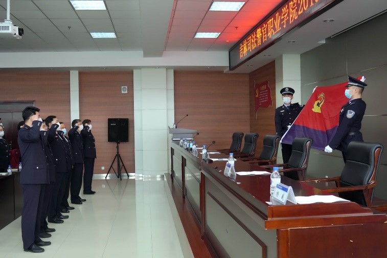 开学典礼上,全体人员面对警旗庄严宣誓:“对党忠诚,服务人民,执法公正,纪律严明。坚定纯洁,让党放心,甘于奉献,能拼善赢。”