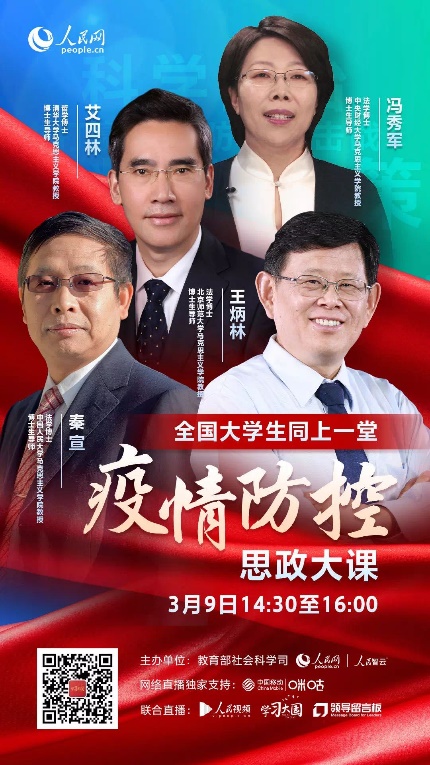 3月9日下午,由教育部社会科学司和人民网共同主办的“全国大学生同上一堂疫情防控思政大课”正式开讲了,全国知名的思政专家艾四林、秦宣、王炳林和冯秀军等四位教授,为全国大学生和思政课教师上了一堂有温度、有亮度、有韧度的高水平思政大课。