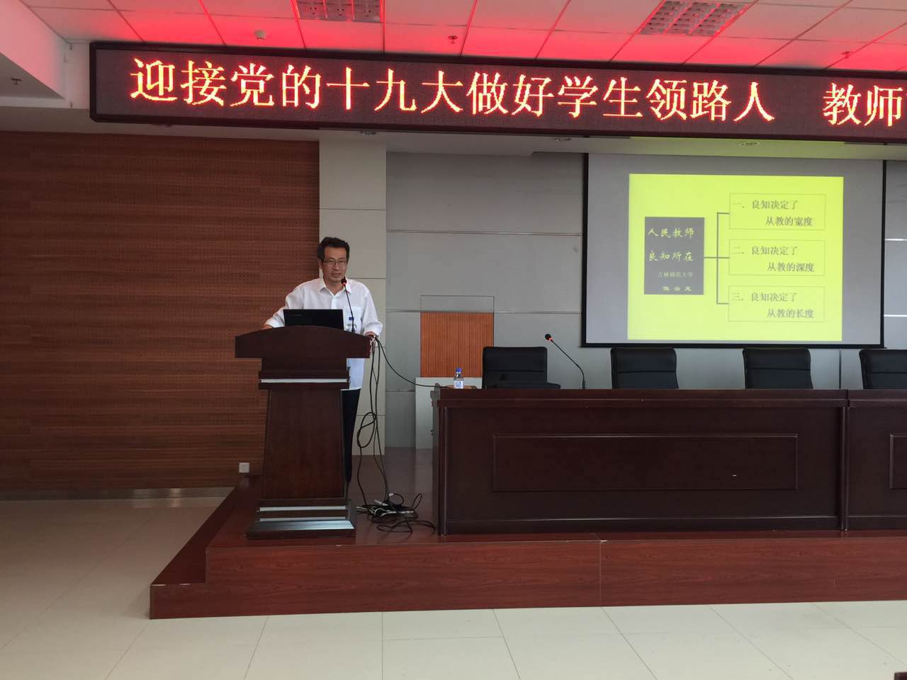 侯云龙教授曾获“全国优秀教师称号”、获国务院政府特殊津贴、吉林省教育系统师德标兵,并入选评师网全国最受欢迎百佳教授。会上,候教授从良知决定了从教的宽度、良知决定了从教的深度、良知决定了从教的长度三个方面为与会人员上了生动的一课。侯云龙教授用自己真实的从教经验诠释了什么是让党和人民满意的“四有”好老师。通过本次专题教育会议引领全体教职工深入学习贯彻习近平总书记系列重要讲话精神,自觉践行师德师风要求,以德立身,以德立学,以德施教,争做“四有好老师”,做好学生引路人,展示当代教师爱岗敬业,无私奉献的形象,大力营造尊师重教的浓厚社会氛围。