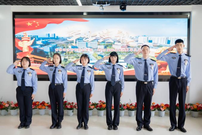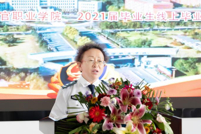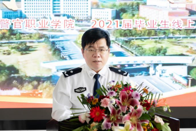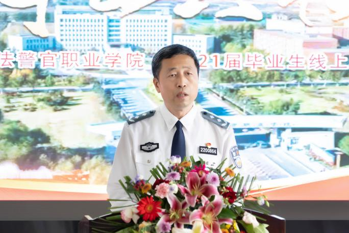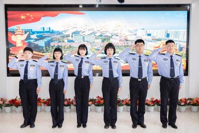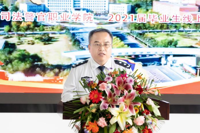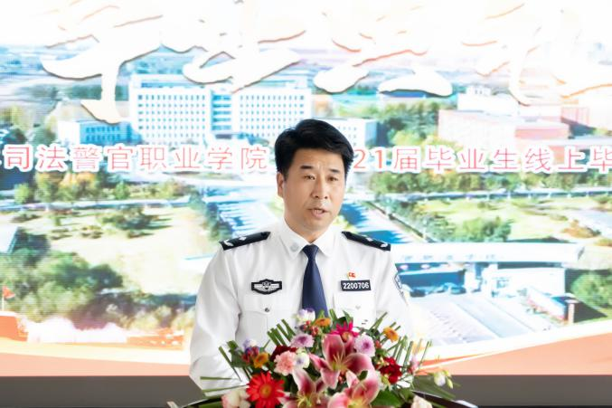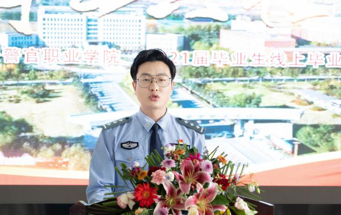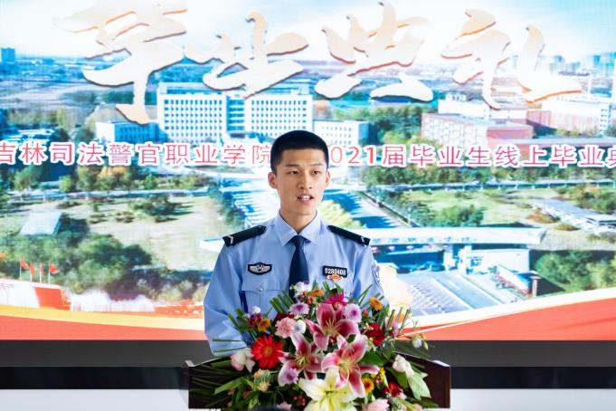2021届毕业生22中队J18303区队学员赵磊代表全体毕业生向母校致谢三年来的教育和培养,讲述了三年来自己在吉司警院的成长和对未来的展望,并表示今后将继续践行“诚、智、律、毅”的校训,勇担时代重任,为人民服务。
