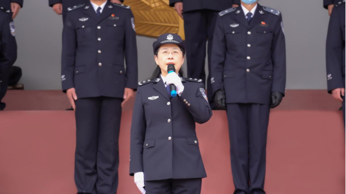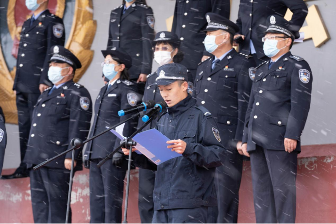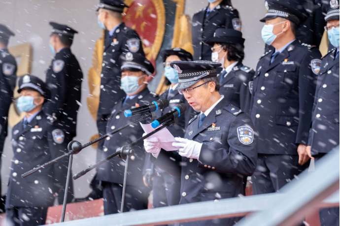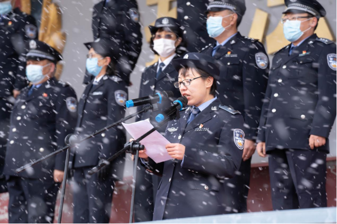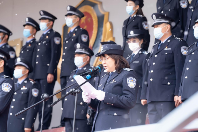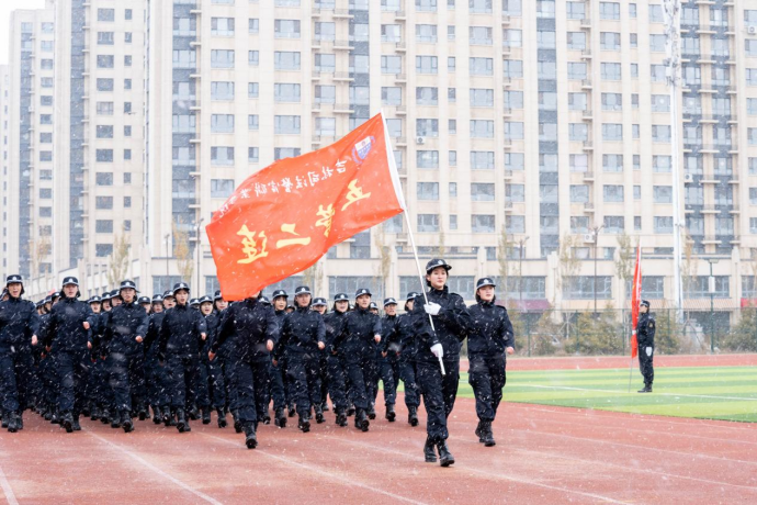 学生2大队大队长冯宇铭整队报告。“开始”,随着党委书记魏秀云一声令下,2021级新生分列式表演正式开始。新生们用挺拔的身姿、整齐的步伐、洪亮的口号,接受检阅。