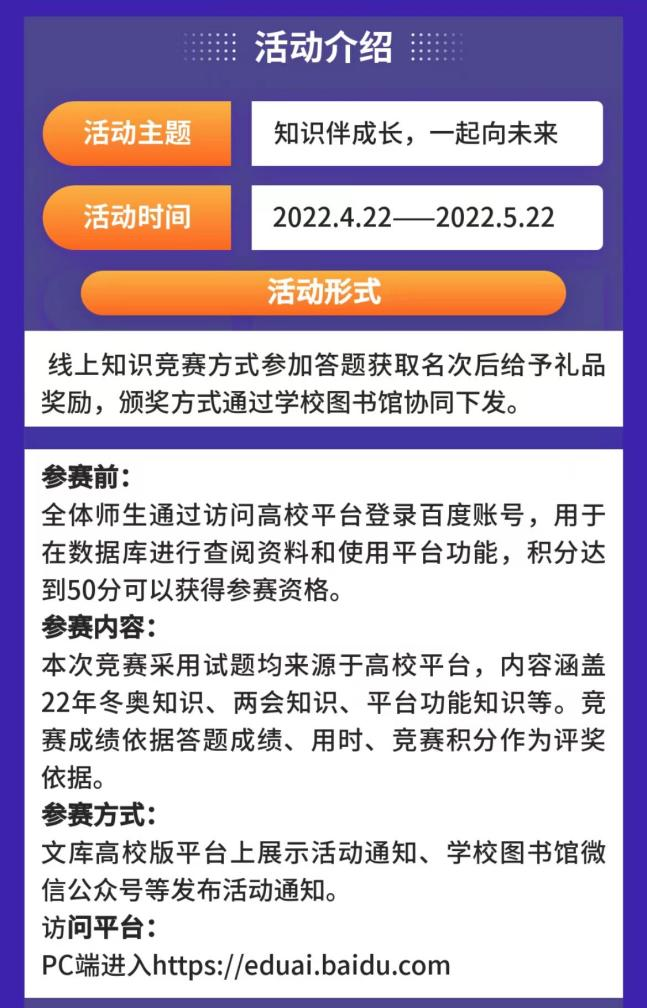 为增进广大学生对百度文库高校版的了解,进一步提高使用百度文库的技巧和效率,借助读书月活动契机,图书馆推送由北京百度网讯科技有限公司主办的2022年在线知识问答活动,帮助学生在疫情期间缓解精神压力的同时,通过趣味问答的形式,更深入地了解冬奥、两会、平台等知识。
