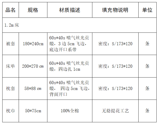 根据学院2023年培训工作需求,现面向社会采购220套床上用品,包括床单、被罩、枕巾、枕套,具体价格以同等质量商品的最低竞标价为准。详细采购目录如下: