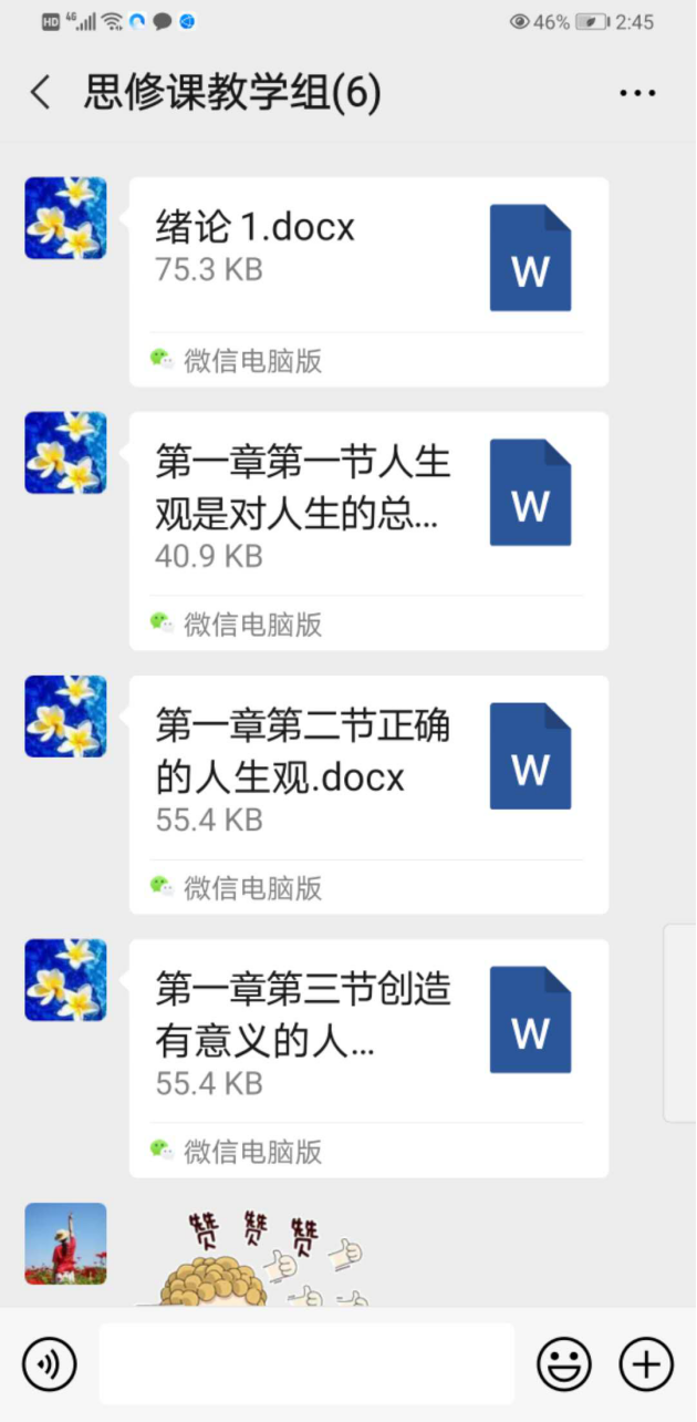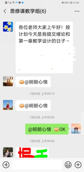 此次备课会的主备课人是姜品竹老师,她在前一周把“一次教学设计”发送到思修课教学群里供教师们审阅,教师们研课把意见反馈给主备人,主备人据此进行“二次教学设计”,并再次发给每一位备课教师,最后根据此“二次教学设计”召开集体备课研讨会。