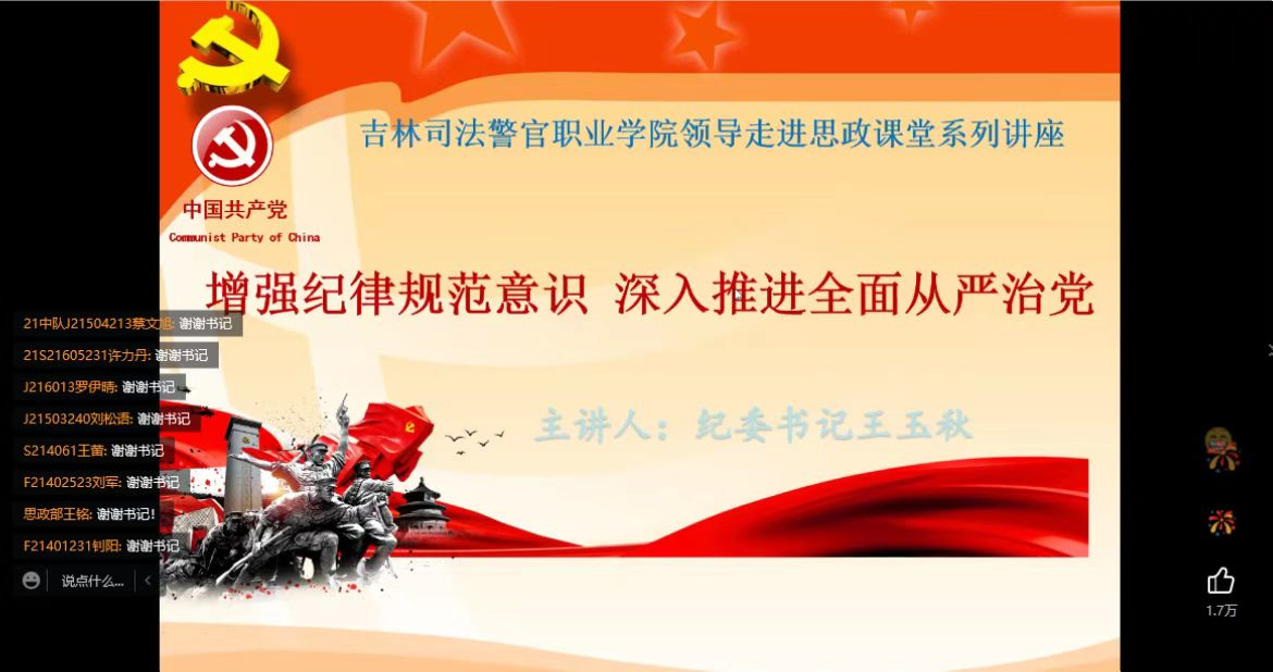 课程最后,王玉秋书记强调,作为新时代的青年,应按照中国共产党党员的标准严格要求自己,遵规守纪,遵守纪律情操,加强学习,提升本领,增强忧患意识和风险意识,自觉做中国特色社会主义道路的坚定捍卫者和忠诚实践者,为早日实现伟大复兴中国梦而努力奋斗。