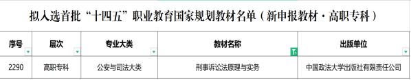 近日,教育部发布了《关于拟入选首批“十四五”职业教育国家规划教材名单的公示》,学院教务处(科研处)处长宁博与北京政法职业学院刘昂、黑龙江司法警官职业学院施秀艳等人,聚焦人才培养目标、深研专业教学标准,编写《刑事诉讼法原理与实务》一书,成功入选全国职业教育规划教材。