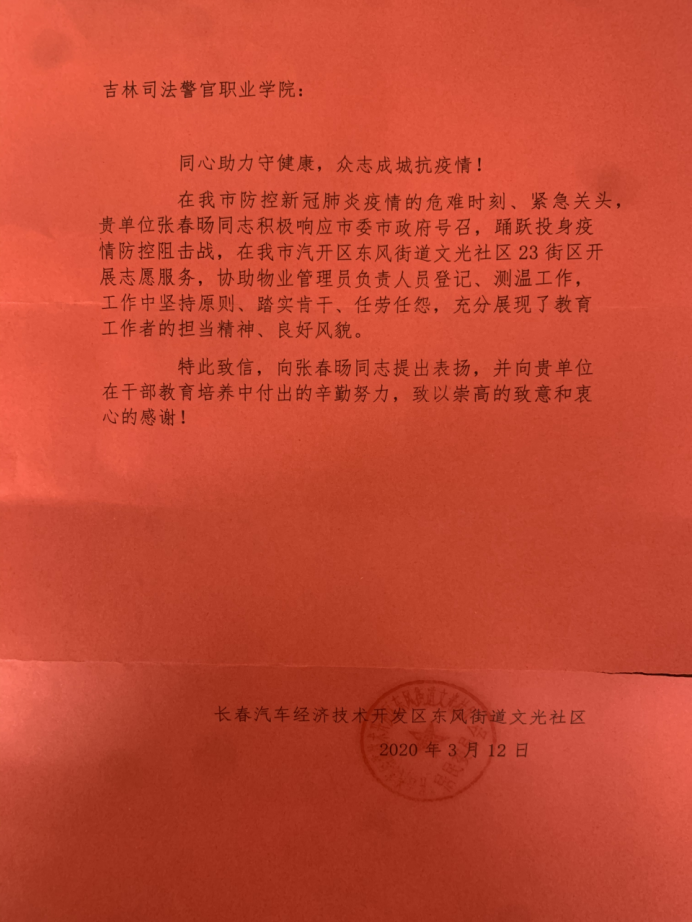 在我市防控新冠肺炎疫情的危难时刻、紧急关头,张春旸同志积极响应市委、市政府号召,踊跃投身疫情防控阻击战,在我市汽开区东风街道文光社区23街区开展志愿服务,协助物业管理员负责人员登记、测温工作,并为抗疫一线人员捐赠品牌大米20袋、豆油20桶。长春市委统战部梁海龙处长在巡查中对该同志坚持原则、踏实肯干、任劳任怨的工作作风予以肯定,充分展现了教育工作者的担当精神、良好风貌。