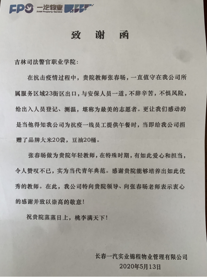 5月13日上午,一汽锦程物业、东风街道文光社区工作人员为我院张春旸同志送来感谢信及锦旗。学院政治处处长王新兰、学生处副处长刘利等同志热情接待。