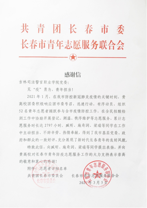 我院臧昕、施奇润、梁瑞等52名同学在抗击新冠肺炎疫情工作中踊跃参与,受到团市委表彰。自新冠肺炎疫情发生以来,我院广大志愿者积极践行社会主义核心价值观,当好疫情防控的“第一响应人”。在因为疫情而未返校的时间里,他们主动请缨、逆行而上、冲锋在前、不惧风险,积极响应学校号召,全力以赴地投身于所在社区街道、城镇乡村的防疫一线志愿服务工作中,投身于疫情防护宣传、线上心理援助、社区排查、防控点值班值守、爱心捐赠等志愿服务工作。服务范围涵盖吉林,四川,海南,新疆维吾尔自治区等多个省、自治区、直辖市。虽然你们来自祖国的大江南北,操着不同的口音,有着不同的面貌,但却同样有着虔诚火热的心和一腔报国的热血。