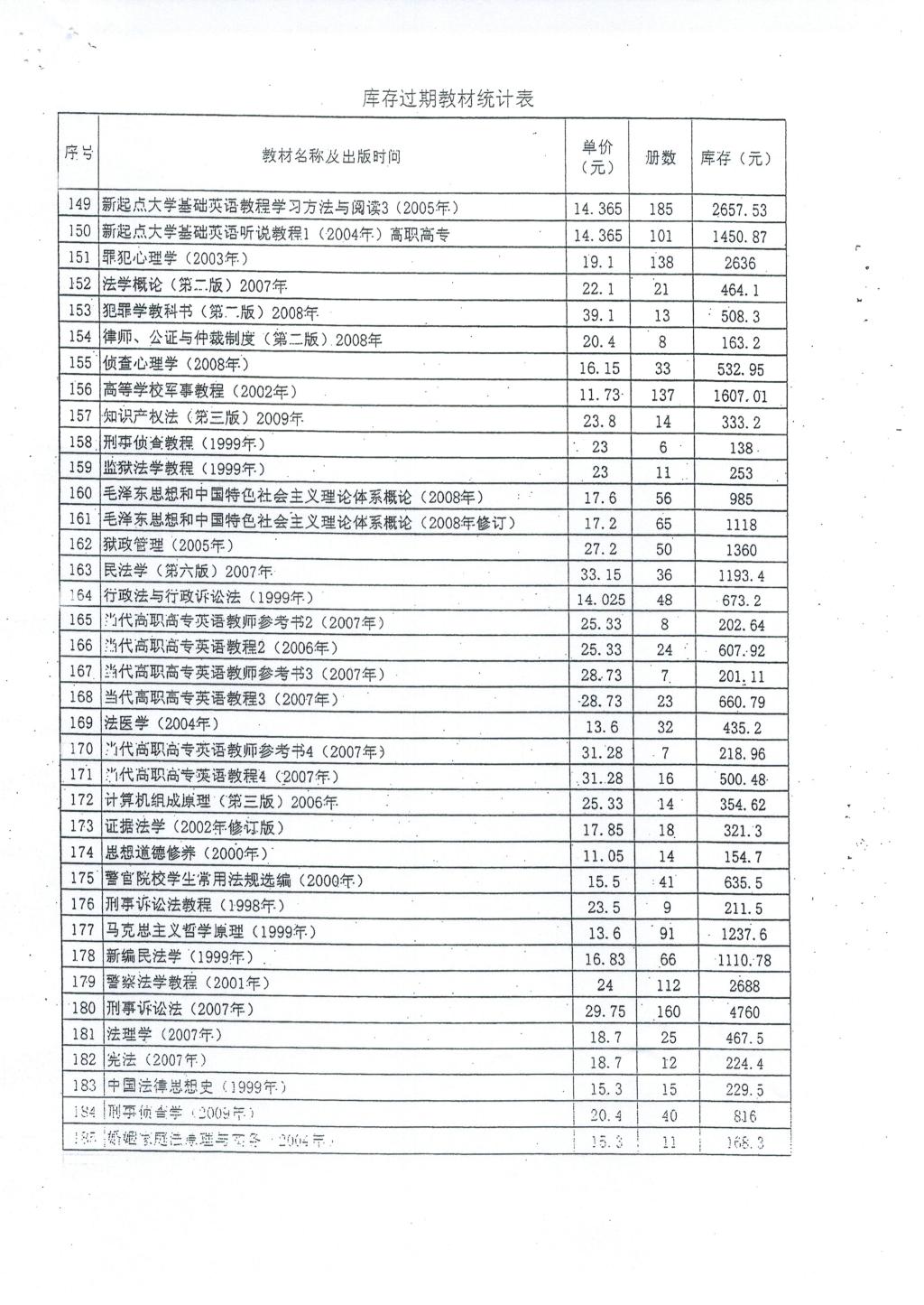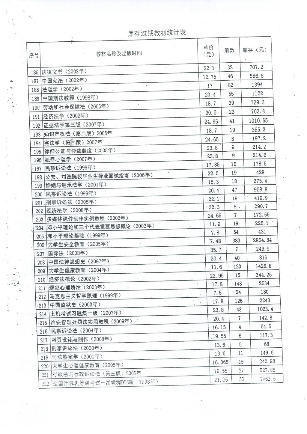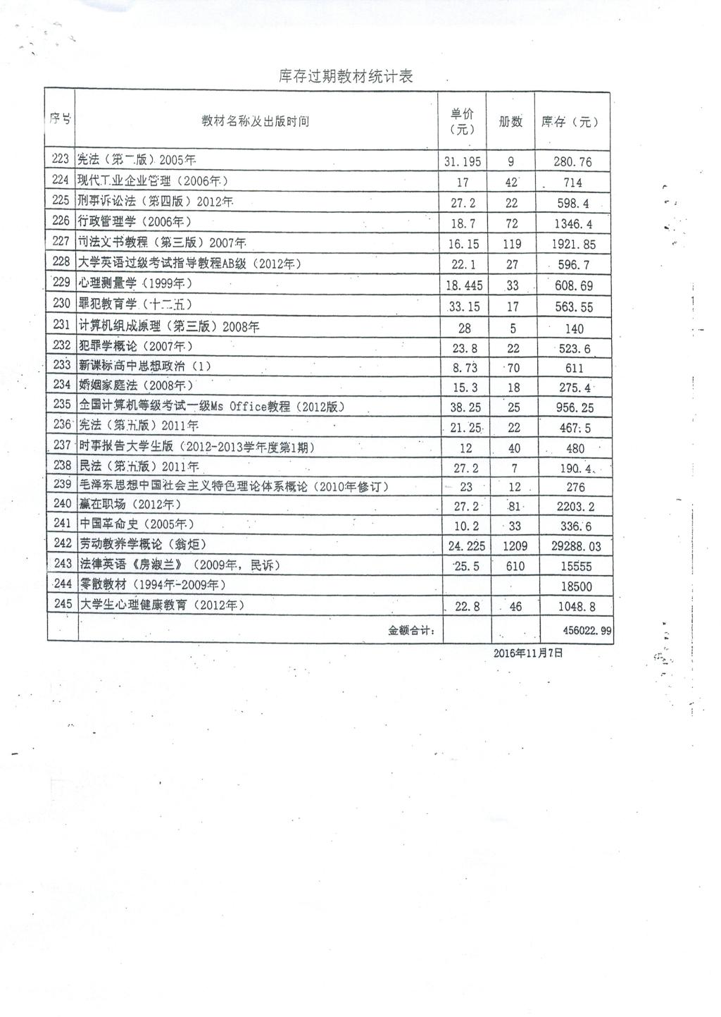 因建校以来,学生用教材始终未进行过清理,部分教材因法律条款修订后,已无法继续使用,目前存放在学院教务处教材库中。现拟对该部分教材作资产报废处理,本次拟进行报废的教材共有245种,价值456,022.99元。现予以公示。如有异议或对该部分教材有其他使用需求,请于本公示发布后3个工作日内向后勤管理处(联系电话83311007)反映。