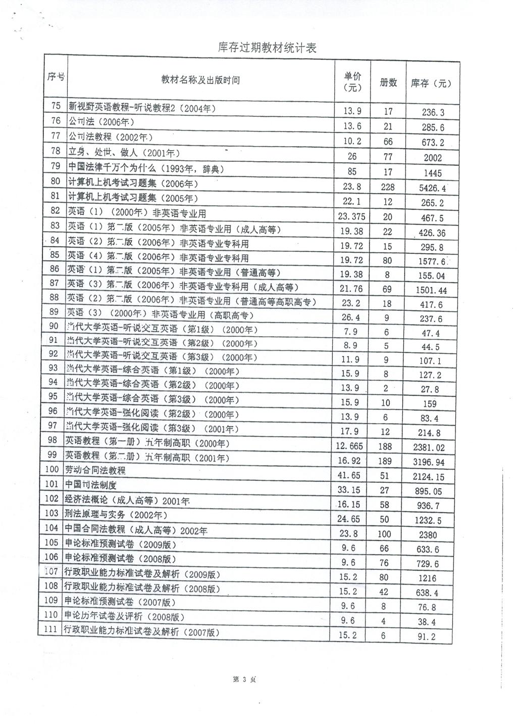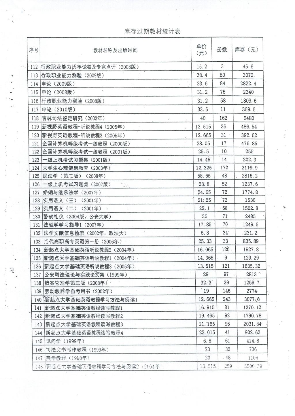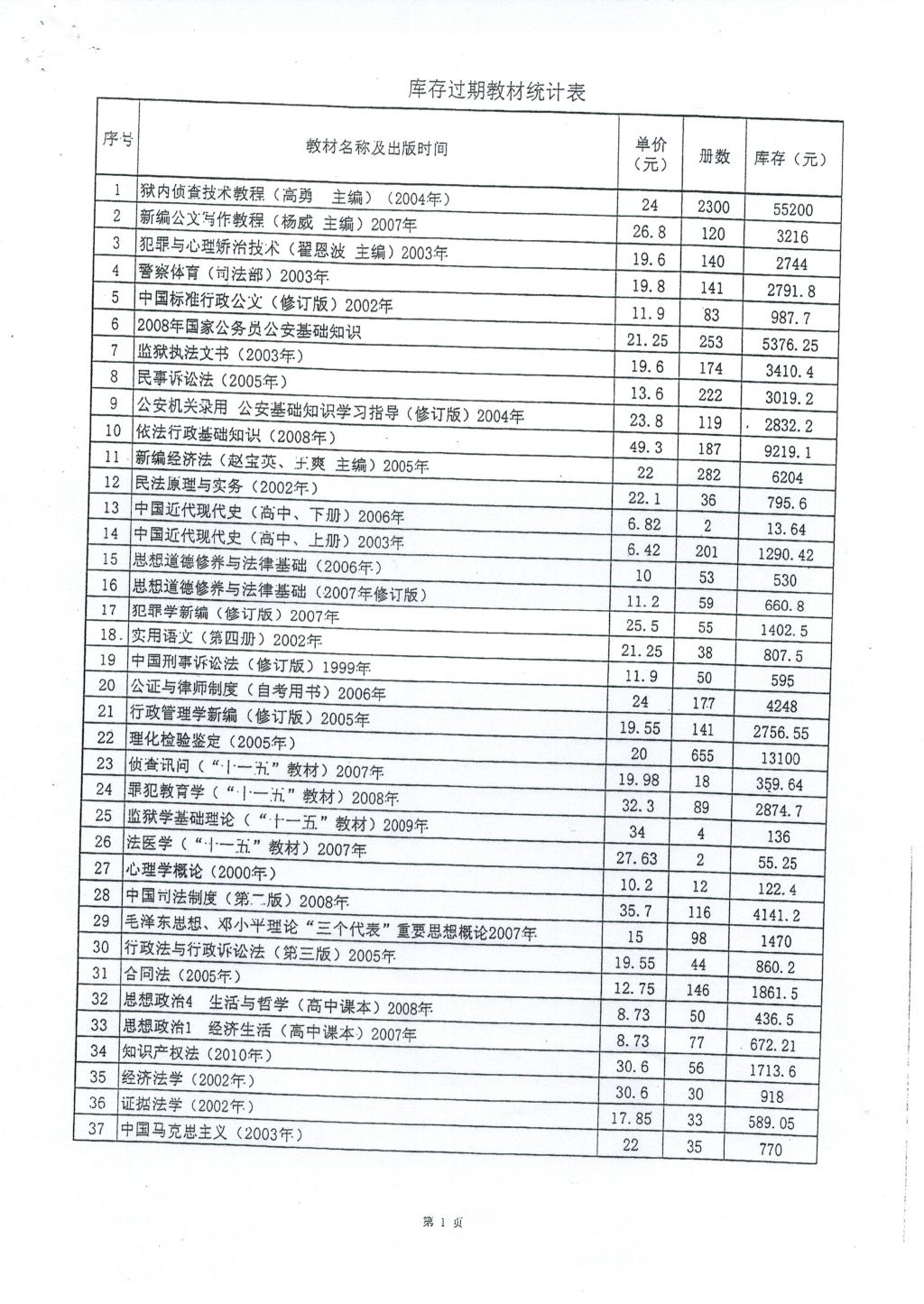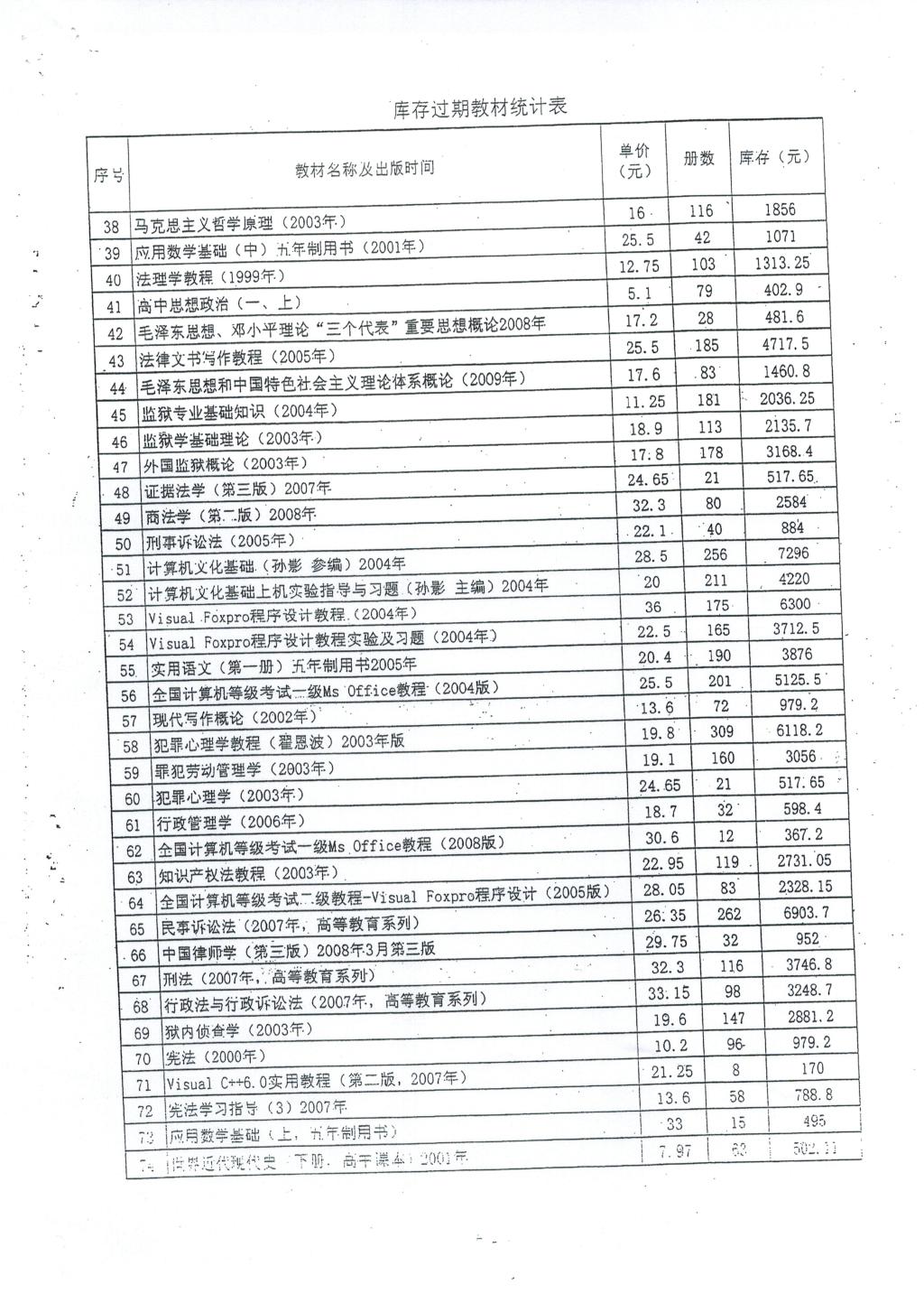 因建校以来,学生用教材始终未进行过清理,部分教材因法律条款修订后,已无法继续使用,目前存放在学院教务处教材库中。现拟对该部分教材作资产报废处理,本次拟进行报废的教材共有245种,价值456,022.99元。现予以公示。如有异议或对该部分教材有其他使用需求,请于本公示发布后3个工作日内向后勤管理处(联系电话83311007)反映。