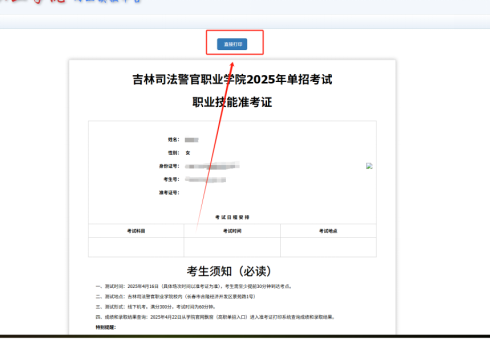 4. 点击上方“直接打印”按钮,即可打印准考证。